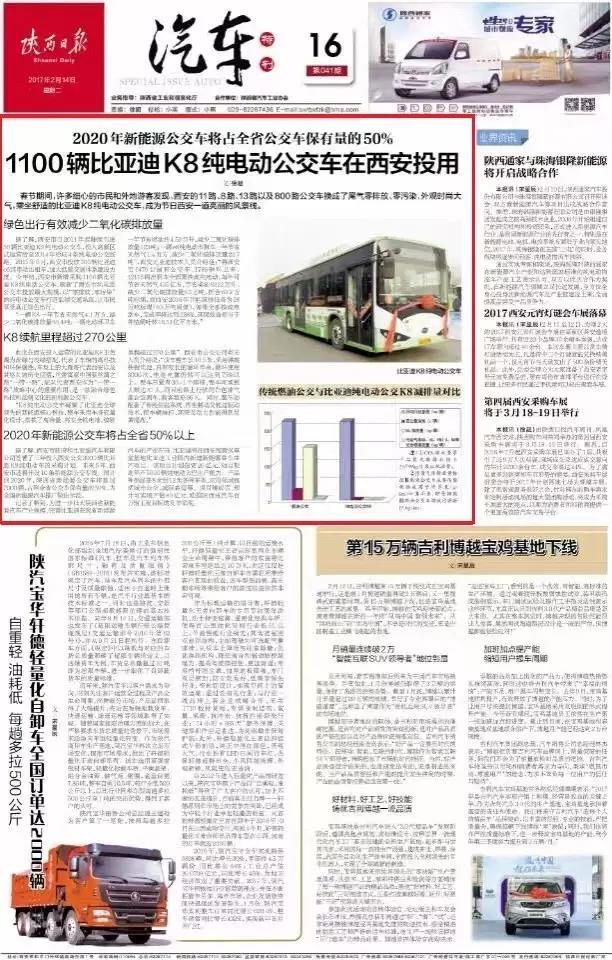 據(jù)了解,西安市政府和比亞迪汽車有限公司簽署了三年投入西安公交3000輛比亞迪K8純電動車的采購計劃。未來5年,西安市還將開設(shè)10條新能源公交專線。預(yù)計到2020年,陜西省新能源公交車將超過7000輛,占到全省公交車保有量的50%,為全國新能源汽車推廣做出示范。
