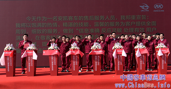 活動(dòng)現(xiàn)場(chǎng),安凱客車(chē)營(yíng)銷(xiāo)服務(wù)隊(duì)員上臺(tái)宣誓,將以飽滿的熱情、精湛的技能、溫馨的服務(wù),為公交集團(tuán)提供最好的售后服務(wù),滿足客戶的需求。