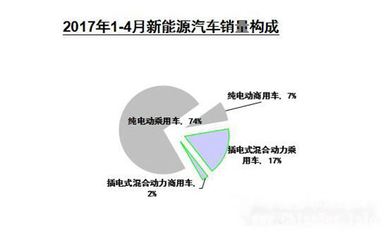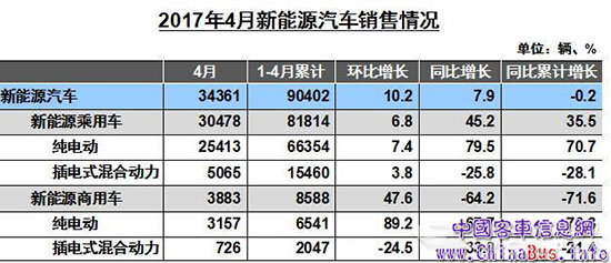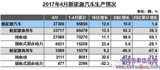 1-4月,新能源汽車生產(chǎn)95856輛,比上年同期增長1.4%;銷售90402輛,比上年同期下降0.2%。其中純電動汽車產(chǎn)銷分別完成78351輛和72895輛,比上年同期分別增長11.0%和9.7%;插電式混合動力汽車產(chǎn)銷分別完成17504輛和17507輛,比上年同期分別下降26.8%和27.4%。