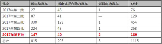 6月2日,工業(yè)和信息化部在官方網(wǎng)站發(fā)布了第296批《道路機(jī)動(dòng)車(chē)輛生產(chǎn)企業(yè)及產(chǎn)品公告》。同時(shí),本批公告中發(fā)布了《新能源汽車(chē)推廣應(yīng)用推薦車(chē)型目錄(2017年第5批)》,共包括189款客車(chē),其中純電動(dòng)客車(chē)147款、插電式混合動(dòng)力客車(chē)40款、燃料電池客車(chē)2款。2017年以來(lái),工信部已累計(jì)發(fā)布5批推薦車(chē)型目錄,共包括1115款客車(chē)。