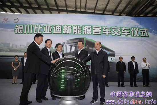 寧夏回族自治區(qū)黨委常委、銀川市委書記徐廣國(右二),寧夏回族自治區(qū)人大黨組副書記、副主任馬三剛(右一),銀川市委副書記、市長白尚成(左二),銀川市委常委、永寧縣委書記錢克孝(左一),比亞迪總裁王傳福(左三)共同啟動銀川比亞迪新能源客車交車儀式
