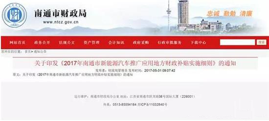 2017年南通市新能源汽車(chē)推廣應(yīng)用地方財(cái)政補(bǔ)貼實(shí)施細(xì)則