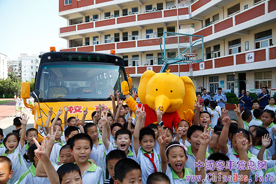 “看,有大象!”活動一開始,金旅校車卡通形象“小金象”就吸引了所有孩子們的目光??蓯鄣男〗鹣笈づけ亲?,揮舞揮手,憨態(tài)可掬,剛出場就被孩子們團團包圍!在小金象的帶領(lǐng)下,十名學生代表一起參觀金旅校車,工作人員為孩子們介紹金旅校車與一般客車的區(qū)別,并為孩子們講解安全乘車的知識。只聽一遍,孩子們就記下了校車安全乘坐小知識,還上臺與其他同學做了分享呢。