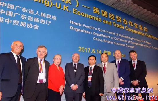 比亞迪董事長兼總裁王傳福(右四)、比亞迪歐洲分公司總經(jīng)理何一鵬(右三)與參會貴賓在中國(廣東)—英國經(jīng)貿(mào)合作交流會上合影