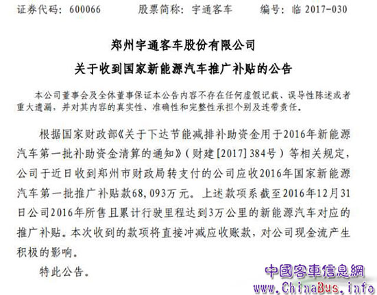 2016年新能源第一批汽車國(guó)補(bǔ)已下發(fā),宇通客車收到6.8億補(bǔ)貼款