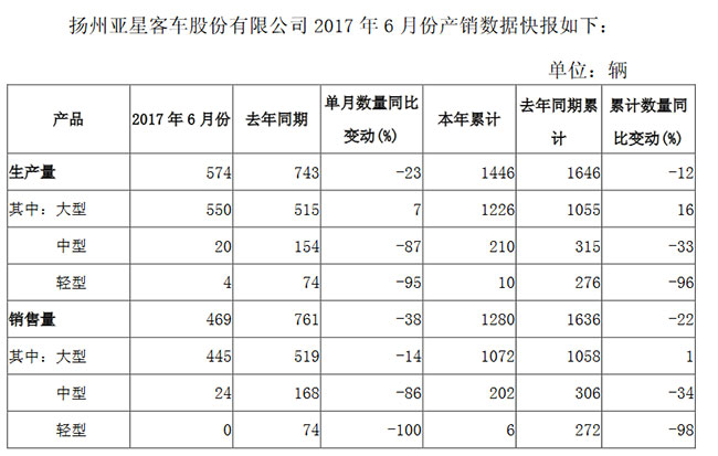 7月6日,揚州亞星客車股份有限公司發(fā)布2017年6月份產銷數(shù)據(jù)快報??靾箫@示,6月份,揚州亞星銷售各類客車469輛,同比下降38%。其中,大型客車銷售445輛,同比下降14%;中型客車銷售24輛,同比下降86%;輕型客車銷量為零。