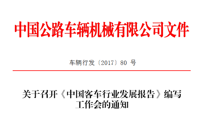 為全面客觀展現(xiàn)我國客車行業(yè)發(fā)展現(xiàn)狀,權(quán)威解讀行業(yè)發(fā)展趨勢與發(fā)展形勢,深度剖析行業(yè)熱點(diǎn)與新政策,推動客車行業(yè)發(fā)展,受交通運(yùn)輸部運(yùn)輸服務(wù)司委托,中國公路學(xué)會客車分會組織編寫《中國客車行業(yè)發(fā)展報告》。定于 7 月 24 日在北京召開《中國客車行業(yè)發(fā)展報告》(2017)(以下簡稱報告)編寫啟動會,特請貴單位派員參加。現(xiàn)將會議有關(guān)事項通知如下: