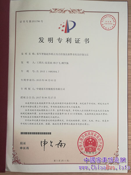 日前,中通客車(chē)申請(qǐng)的發(fā)明專(zhuān)利“一種客車(chē)智能起步阻止綜合控制及報(bào)警裝置”通過(guò)國(guó)家知識(shí)產(chǎn)權(quán)局審查,獲得國(guó)家知識(shí)產(chǎn)權(quán)局發(fā)明專(zhuān)利授權(quán),授權(quán)專(zhuān)利號(hào)“ZL201510481604.7”。