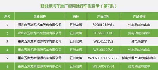 2017年7月31日,工信部發(fā)布(2017年第7批) 《新能源汽車推廣應(yīng)用推薦車型目錄》,五洲龍股份有6款車型進(jìn)入推薦目錄。