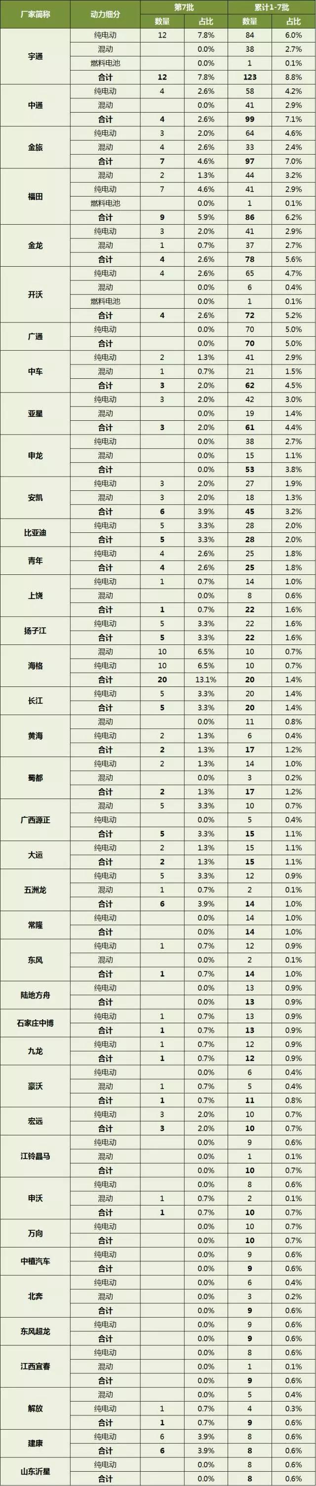 第1-7批中國客車企業(yè)新能源客車推廣應(yīng)用推薦車型統(tǒng)計(jì)