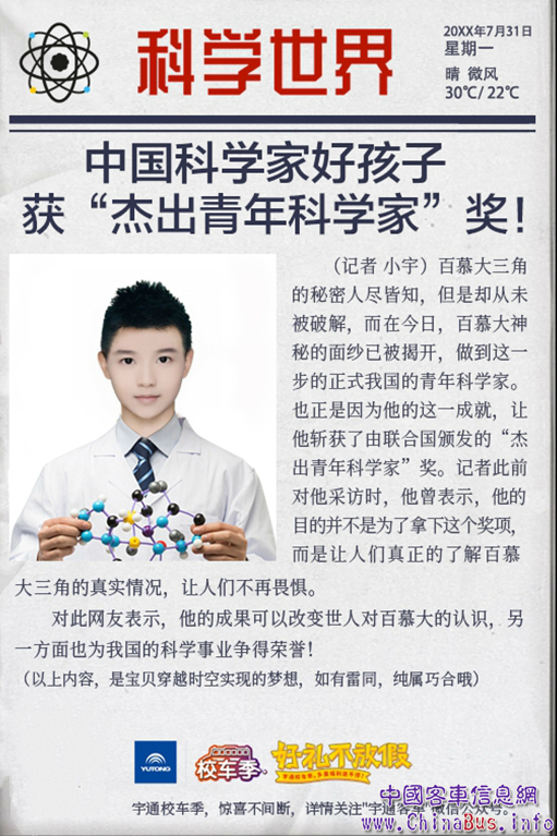 隨著一天一天長大,每一個(gè)孩子逐漸有了自己的價(jià)值取向,有了對(duì)未來的憧憬和期盼,有了人生中最純真的夢(mèng)想。在夢(mèng)想的彼岸,我們的孩子將長大成為什么樣子?而宇通的神奇校車這次就將帶領(lǐng)各位家長穿梭時(shí)空去看一看。