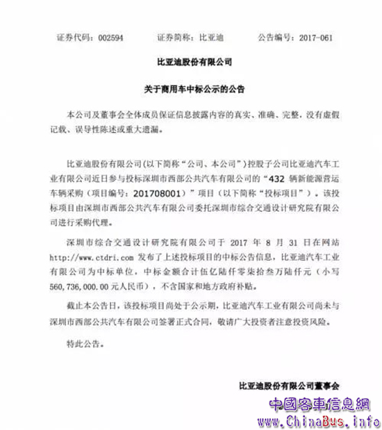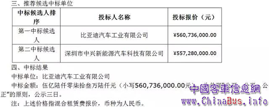 公告顯示,深圳市綜合交通設(shè)計(jì)研究院有限公司于2017年8月31日在網(wǎng)站發(fā)布了上述投標(biāo)項(xiàng)目的中標(biāo)公告信息,比亞迪汽車工業(yè)有限公司為中標(biāo)單位,中標(biāo)金額合計(jì)約人民幣5.61億元,不含國家和地方政府補(bǔ)貼。