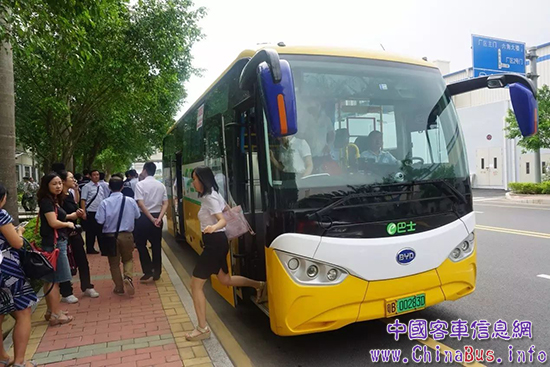 以“互聯(lián)網(wǎng)+新能源+傳統(tǒng)公交”模式,東部公交開通“e巴士”線路,探索出一條打造高品質(zhì)定制巴士的新路。自2016年1月投入使用以來,“e巴士”品質(zhì)公交截至今年3月已服務乘客500萬人次。當天,東部公交駕駛員和媒體朋友乘坐C8純電動客車品質(zhì)公交來到比亞迪坪山總部。