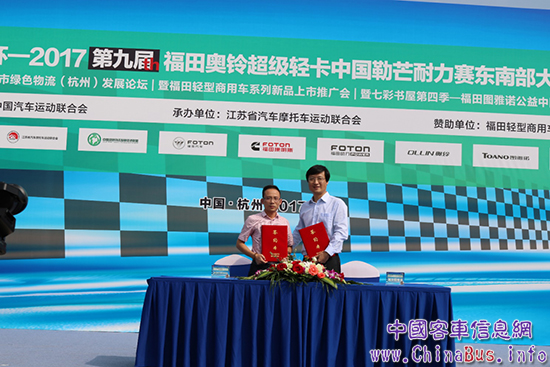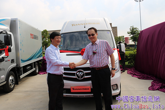 江蘇省汽車摩托車運動聯(lián)合會主席郝星辰(右)和福田商用汽車集團商務(wù)汽車業(yè)務(wù)總監(jiān)潘林波(左)為福田圖雅諾S高頂商旅版國五新品揭幕