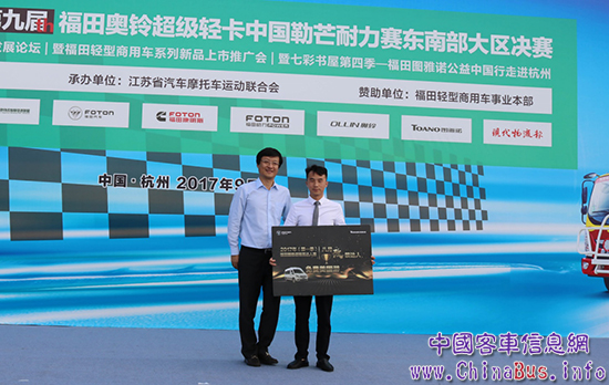 福田商用汽車集團商務(wù)汽車業(yè)務(wù)總監(jiān)潘林波(左)為福田圖雅諾精英達人賽八月份精英達人賽冠軍徐超(右)頒獎