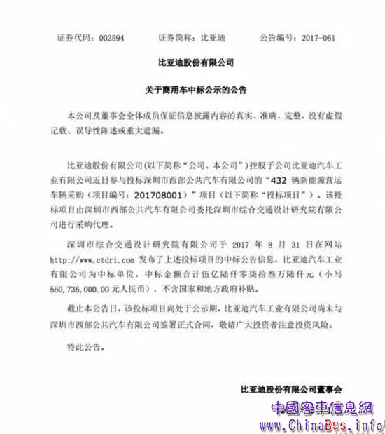 公告顯示,深圳市綜合交通設(shè)計研究院有限公司于2017年8月31日在網(wǎng)站發(fā)布了上述投標項目的中標公告信息,比亞迪汽車工業(yè)有限公司為中標單位,中標金額合計約人民幣5.61億元,不含國家和地方政府補貼。