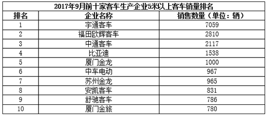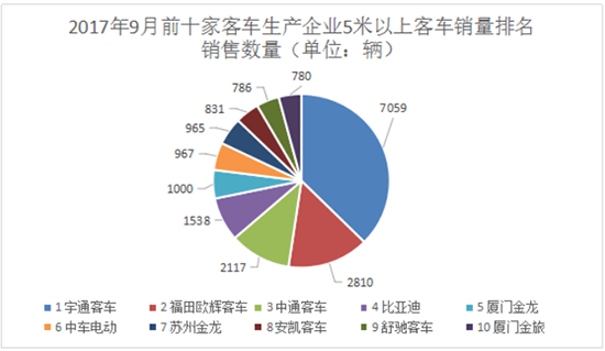 從上表中可以看出,2017年9月,宇通客車(chē)共銷(xiāo)售5米以上客車(chē)7059輛,成為了當(dāng)之無(wú)愧的銷(xiāo)售冠軍;福田歐輝銷(xiāo)售5米以上客車(chē)2810輛,位居第二;中通位居第三,銷(xiāo)售5米以上客車(chē)2117輛;比亞迪第四,銷(xiāo)售5米以上客車(chē)1538輛;廈門(mén)金龍第五,銷(xiāo)售5米以上客車(chē)1000輛;中車(chē)電動(dòng)第六,銷(xiāo)售5米以上客車(chē)967輛;蘇州金龍第七,銷(xiāo)售5米以上客車(chē)965輛;安凱客車(chē)第八,銷(xiāo)售5米以上客車(chē)831輛;舒馳客車(chē)第九,銷(xiāo)售5米以上客車(chē)786輛,廈門(mén)金旅第十,銷(xiāo)售5米以上客車(chē)780輛。