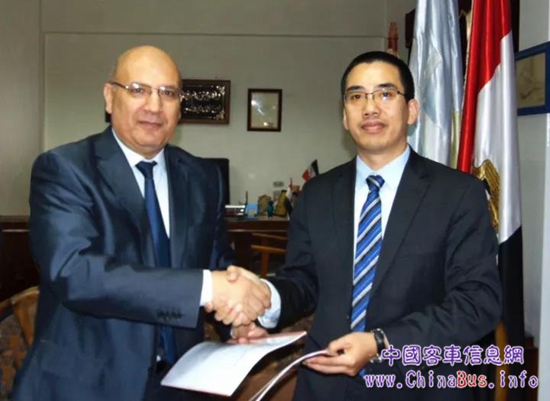 活動(dòng)現(xiàn)場(chǎng),比亞迪中東非洲汽車銷售事業(yè)部總經(jīng)理黃志學(xué)(右)與亞歷山大市交通管理局主席KhaledEleiwa進(jìn)行簽約