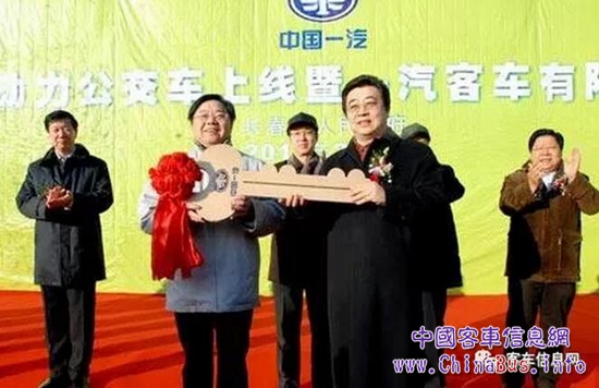 2010年2月1日, 一汽50輛氣電混合動(dòng)力公交客車投入運(yùn)營(yíng)。圖為時(shí)任一汽集團(tuán)公司總經(jīng)理、黨委副書記的徐建一向時(shí)任長(zhǎng)春公交集團(tuán)公司董事長(zhǎng)的崔樹森(前排右)交付新車“金鑰匙”。