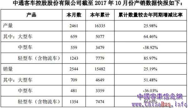 11月6日,中通客車控股股份有限公司發(fā)布2017年10月份產(chǎn)銷快報??靾箫@示,10月份,中通客車銷售各類客車2544輛,其中大型客車銷709輛,中型客車銷481輛,輕型客車(含物流車)銷1354輛。
