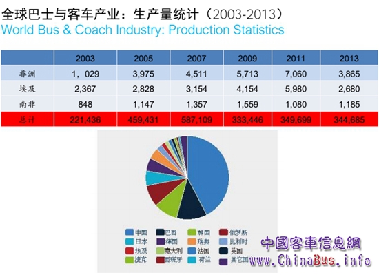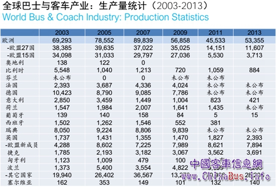 目前全球巴士與客車產(chǎn)業(yè)歐盟相關(guān)的研究項目包括:零排放的城市巴士系統(tǒng)、歐洲未來巴士系統(tǒng)、城市公共交通的電動化等。隨后,王健還介紹了全球巴士與客車產(chǎn)業(yè)的生產(chǎn)情況,具體如下圖: