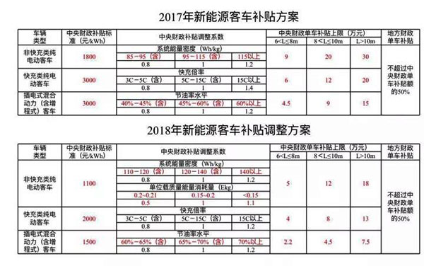 2018年補(bǔ)貼方案中,新能源客車(chē)三個(gè)類(lèi)別(非快充類(lèi)純電動(dòng)客車(chē)、快充類(lèi)純電動(dòng)客車(chē)、插電混動(dòng)客車(chē))的中央財(cái)政補(bǔ)貼標(biāo)準(zhǔn)全面下調(diào),分別調(diào)整為1100元/kWh、2000元/kWh、1500元/kWh。