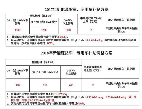 2018年新能源貨車(chē)、專(zhuān)用車(chē)補(bǔ)貼方案的三個(gè)檔次補(bǔ)貼標(biāo)準(zhǔn)相比2017年全面下調(diào),分別變?yōu)?00元/kWh、750元/kWh、650元/kWh。單車(chē)補(bǔ)貼上限由15萬(wàn)元調(diào)整為10萬(wàn)元。