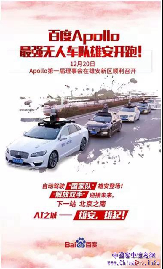 12月20日,百度Apollo第一屆理事會在雄安新區(qū)順利召開。河北省委常委、副省長,雄安新區(qū)黨工委書記、管委會主任陳剛,百度集團(tuán)總裁兼首席運營官陸奇,以及金龍汽車集團(tuán)總裁謝思瑜、金龍客車常務(wù)副總經(jīng)理周方明等9家汽車、科技領(lǐng)先企業(yè)的高層共同見證了Apollo理事會成立。