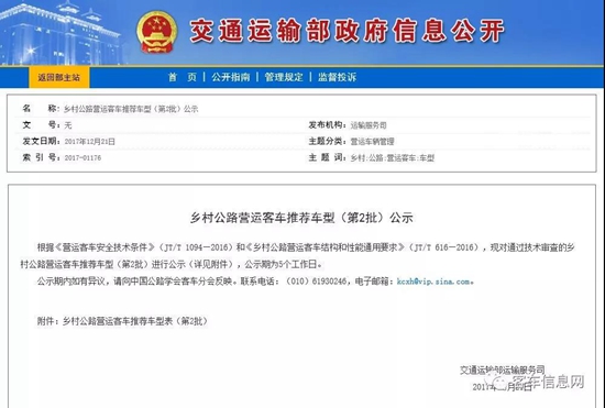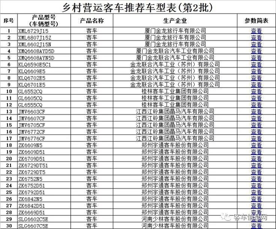 12月21日,交通運(yùn)輸部發(fā)布了《鄉(xiāng)村公路營運(yùn)客車推薦車型(第2批)》公示,本批推薦車型中共包括7家企業(yè)的34款車型。據(jù)了解,上榜的企業(yè)分別為廈門金旅、廈門金龍、蘇州金龍、桂林客車、江鈴晶馬、宇通客車以及河南少林客車,值得注意的是,宇通客車共入選11款車型。
