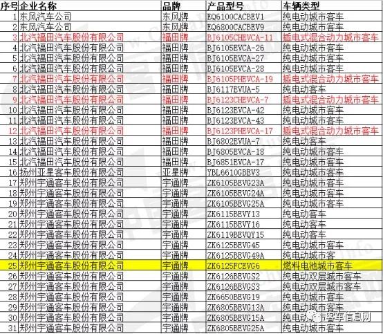 據中國客車信息網統計,本批新能源車型目錄中共包括客車產品62款,其中包括純電動客車56款,插電式混合動力客車4款,燃料電池客車2款。2款燃料電池客車分別來自鄭州宇通和廈門金龍,產品型號為宇通ZK6125FCEVG6和金龍XMQ6127AGFCEV車型。
