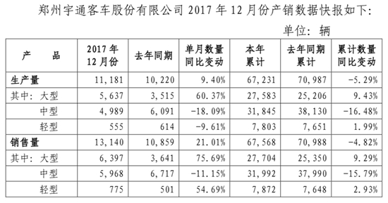 1月4日晚,宇通客車公布了12月份及2017年全年產(chǎn)銷數(shù)據(jù)。數(shù)據(jù)顯示,2017年12月,宇通客車共生產(chǎn)客車11181輛,同比去年增長(zhǎng)了9.40%,環(huán)比增長(zhǎng)22.45%;共銷售客車13140輛,其中包括大型客車6397輛,中型客車5968輛,輕型客車775輛,同比去年增長(zhǎng)了21.01%,環(huán)比增長(zhǎng)70.96%。
