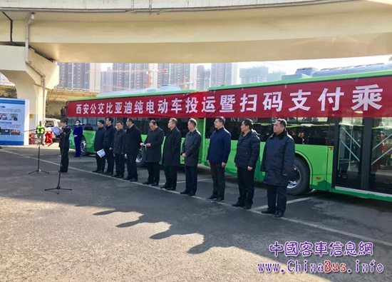 2018年1月9日,“西安公交比亞迪純電動車投運暨掃碼乘車啟動儀式”在辛家廟公交調度站舉行。繼2016年底投放1100輛比亞迪純電動公交車之后,西安市本次將再投放1900輛比亞迪純電動公交車。