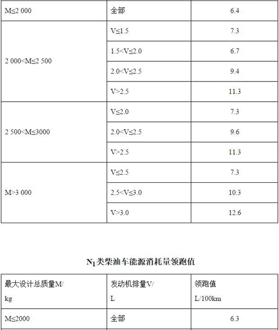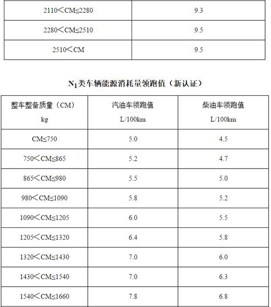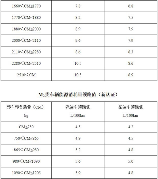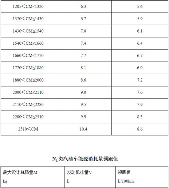 2.輕型商用車輛:N1類及最大設(shè)計總質(zhì)量不超過3500kg的M2類車輛,按照新、舊標準中不同的車型分類,能源消耗量領(lǐng)跑值分別見附表2-附表7;