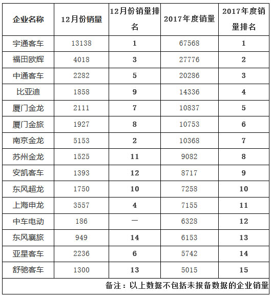 2017年12月份和年度銷量排行榜(前15位企業(yè),5米以上客車,單位:輛)