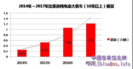 2017年,在全國新能源客車整體銷量同比大幅下滑背景下,比亞迪客車實(shí)現(xiàn)逆勢增長,全年銷量14336輛(全部為純電動,含控股公司廣汽比亞迪1559輛),同比增長8%。其中,8米以上銷量達(dá)14254輛,同比增長13.6%,占總銷量99%;10米以上銷量達(dá)12228輛,同比增長14.5%,占總銷量85%,位居全國新能源大客車銷量第一!