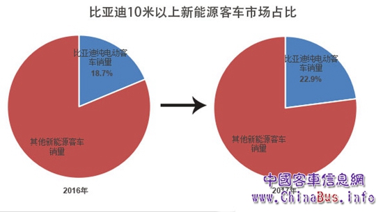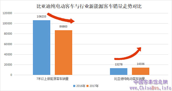 事實上,比亞迪客車一直穩(wěn)居行業(yè)前列。2016年,比亞迪以13278輛的銷量位居行業(yè)第三;2017年,得益于整體銷量與市場占有率“雙增長”的出色業(yè)績,比亞迪行業(yè)排名再次晉級,位居行業(yè)第二。