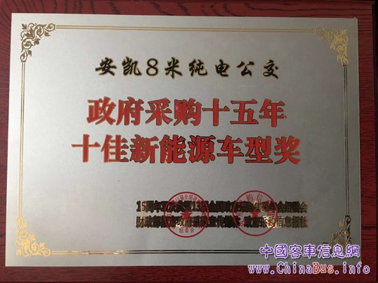 安凱客車作為優(yōu)秀汽車供應(yīng)商代表應(yīng)邀參加了此次年會,經(jīng)過網(wǎng)絡(luò)投票和評標專家的評審,安凱客車榮獲兩項重量級大獎——安凱寶斯通榮獲“2017年度全國政府采購高端公務(wù)接待首選車型獎”、安凱8米純電公交車榮獲“政府采購15年十佳新能源車型獎”。榮譽的背后是對安凱客車多年來在政府采購領(lǐng)域出色表現(xiàn)的充分肯定。