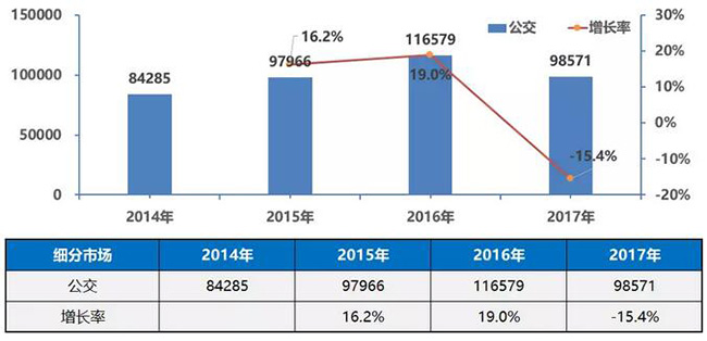 1、公交客車市場(chǎng)是受到新能源影響最大的細(xì)分市場(chǎng),連續(xù)高增長(zhǎng)至2016年突破11萬(wàn)輛,2017年萎縮至9.8萬(wàn)輛。