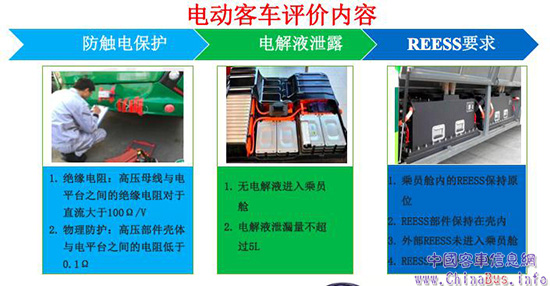 試驗(yàn)過(guò)后,專用校車評(píng)價(jià)內(nèi)容涉及車身結(jié)構(gòu)、約束系統(tǒng)和乘員損傷;電動(dòng)客車評(píng)價(jià)內(nèi)容涉及防觸電保護(hù)、電解液泄露、REESS要求,評(píng)價(jià)內(nèi)容如圖: