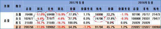 根據(jù)客車(chē)合格證數(shù)據(jù)顯示,2017年,客車(chē)行業(yè)總銷(xiāo)量為20萬(wàn)輛,同比下降11.5%。其中,純電動(dòng)四季度繼續(xù)受搶補(bǔ)貼政策因素影響,全年銷(xiāo)量達(dá)91704輛,銷(xiāo)量占整個(gè)客車(chē)行業(yè)的45.7%,不過(guò)主要是在公交車(chē)市場(chǎng),公路車(chē)方面還是常規(guī)動(dòng)力為主;而公路車(chē)銷(xiāo)量同比下降17.0%;公交車(chē)銷(xiāo)量總體同比下降5.6%,其中純電動(dòng)公交車(chē)占比7成以上;校車(chē)銷(xiāo)量同比下降16.7%。