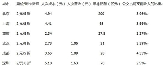 比較幾個城市的公交票價(jià)與成本和政府每年為低票價(jià)的補(bǔ)貼(不考慮換乘優(yōu)惠),結(jié)果一目了然。北京、上海公交人次成本都超過4元,而企業(yè)實(shí)際票價(jià)收入不到成本的一半;武漢、成都、重慶等城市,考慮公交換乘優(yōu)惠,企業(yè)營收入不到成本一半。