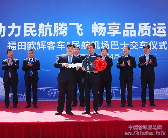 【福田汽車歐輝客車事業(yè)部國(guó)內(nèi)營(yíng)銷公司總經(jīng)理王曉亮向北京民航機(jī)場(chǎng)巴士有限公司副總經(jīng)理許哲文交付車鑰匙】
