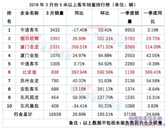 尤為值得一提的是,本月比亞迪憑借新能源客車“一枝獨秀”躋身行業(yè)整體銷量第六位,3月份銷量838輛,同比增長392.94%,一季度銷量1138輛,同比增長569.41%。在驚嘆比亞迪驚人的增長勢頭的同時,也可以看出新能源客車發(fā)展逐步常態(tài)化的趨勢。