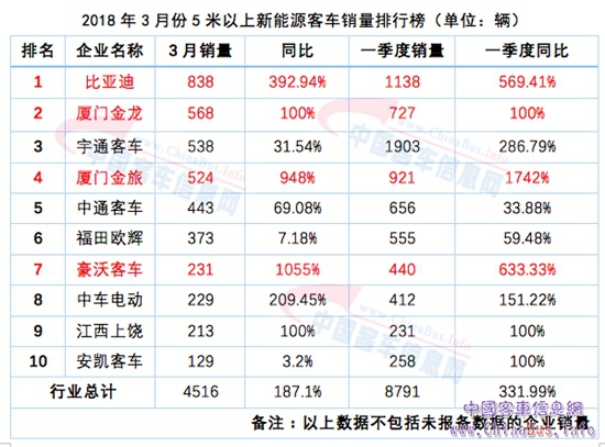 3月份,5米以上新能源客車銷量4516輛,同比增長187.1%,相比2月份漲幅進一步加大。2018年一季度,5米以上新能源客車銷量8791輛,同比增長331.99%。