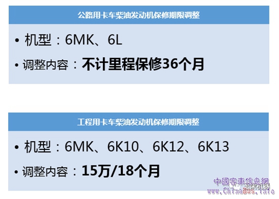 執(zhí)行時間:2018年1月1日起用戶所購買的車輛/機組(以銷售日期為準)均可享受上述政策。具體零部件的保修期限按2018年《發(fā)動機產(chǎn)品質(zhì)量保修規(guī)定》發(fā)布版執(zhí)行。