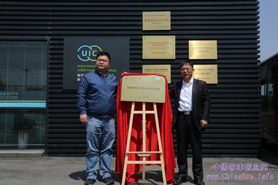 廈門金旅董事長(zhǎng)吳文彬(右)與上海國(guó)際汽車城(集團(tuán))有限公司總經(jīng)理助理陳海林(左)共同揭牌“智能網(wǎng)聯(lián)汽車聯(lián)合創(chuàng)新實(shí)驗(yàn)室”
