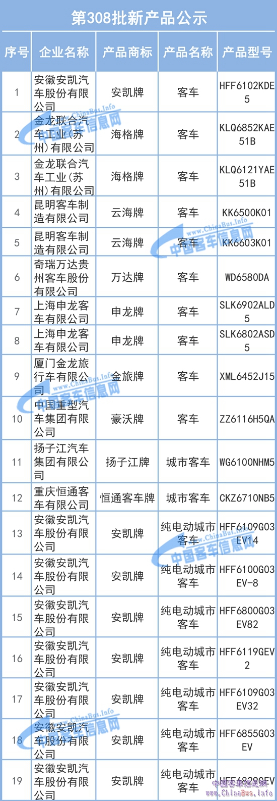 5月17日,工信部發(fā)布了第308批《道路機(jī)動(dòng)車輛生產(chǎn)企業(yè)及產(chǎn)品公告》新產(chǎn)品公告,申報(bào)本批公告的共640家企業(yè)的2585款產(chǎn)品,其中客車產(chǎn)品228款。