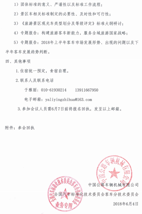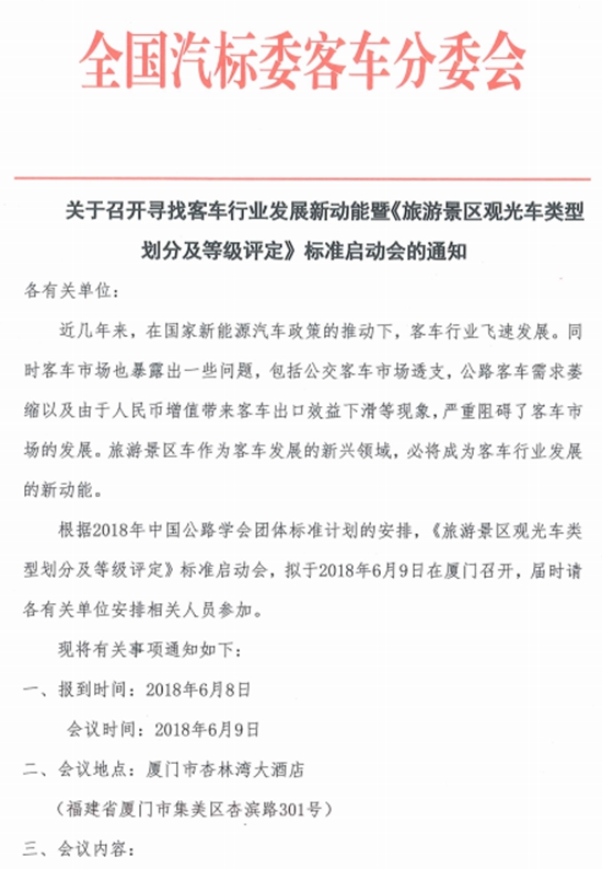 6月9日,尋找客車行業(yè)發(fā)展新動(dòng)能暨《旅游景區(qū)觀光車類型劃分及等級(jí)評(píng)定》標(biāo)準(zhǔn)啟動(dòng)會(huì)將在廈門召開。以下為全國汽標(biāo)委客車分委會(huì)發(fā)出的通知: