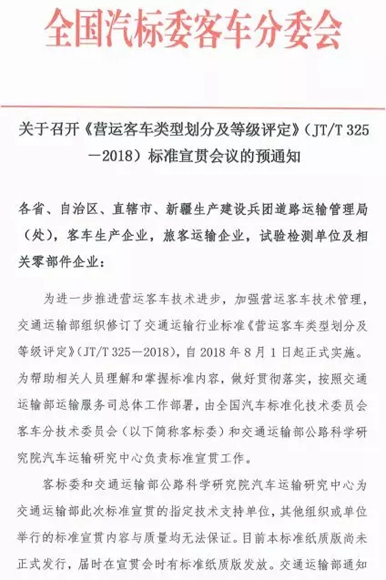 6月13日,全國汽標(biāo)委客車分委會(huì)發(fā)布了關(guān)于召開《營運(yùn)客車類型劃分及等級(jí)評(píng)定》(JT/T 325-2018)標(biāo)準(zhǔn)宣貫會(huì)議的預(yù)通知,以下為通知原文。
