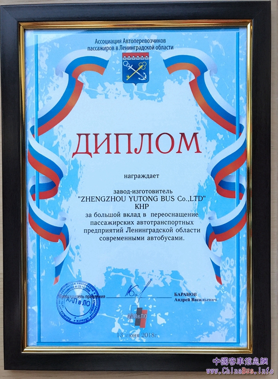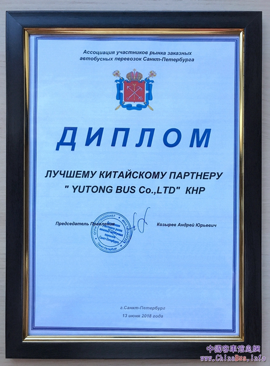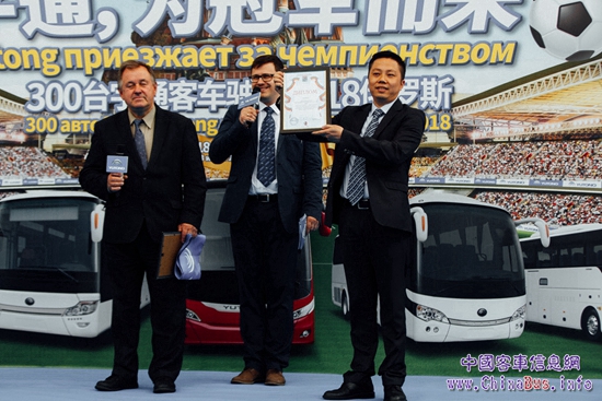 交車儀式上,身著民族盛裝的俄羅斯姑娘為來自中國的貴賓獻上代表待客最高禮遇的面包和鹽;中方代表則將象征友誼和智慧的中國結禮贈俄方。圣彼得堡運輸協(xié)會授予宇通“最佳中國伙伴”榮譽,列寧格勒州運輸協(xié)會授予宇通“最佳旅游巴士供應商”榮譽,并期待雙方在交通運輸領域有更深入的合作。宇通客車、SpbTransBus企業(yè)負責人分別致辭,讓這份共贏的期盼,續(xù)奏雙方合作樂章。